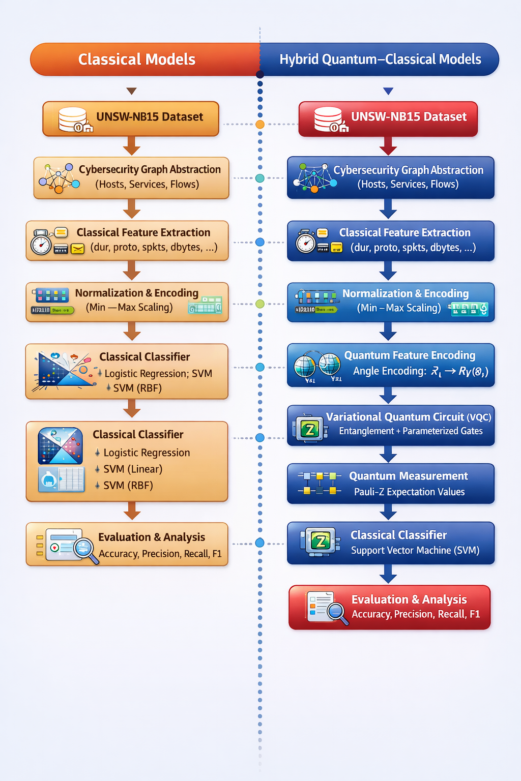 为验证这一假设,我们创建并执行了一个五步混合架构,并在UNSW-NB15数据集 [moustafa2015unsw] 上进行了评估。该数据集是一个广泛采用的网络入侵检测基准,包含约250万个包含正常流量和攻击流量的网络流。我们的方法将经典的图预处理与量子特征映射相结合,采用角度编码和变分量子电路将经典特征转换为量子表示。然后将这些量子嵌入与经典机器学习分类器(支持向量机)结合用于攻击分类,并在数据丰富和数据稀缺条件下与经典基线(逻辑回归、线性SVM、RBF SVM)进行比较评估。