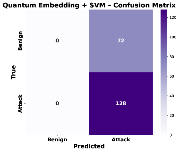 量子嵌入加SVM模型在相同的200个样本约束下进行了评估,提供了在低数据场景下与经典基线的直接比较。该量子模型的准确率为64%,对攻击类型实现了完美的召回率(100%),但始终未能检测到良性样本,因此其宏平均F1分数为0.39,如表4和图3所示。该表以类别级别的精确率、召回率、F1分数和支持度的形式报告结果,图表用于对指标总体趋势和类别级别预测行为进行可视化评估。相比之下,图4中的混淆矩阵说明了类别级别的预测行为,清楚地显示所有良性样本被误分类为攻击,而所有攻击样本被正确检测。