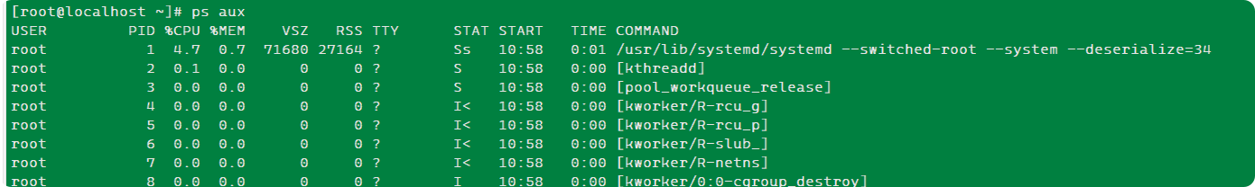 ps aux:查看系统中所有进程的关键信息,包括用户、PID(进程唯一ID)、CPU/内存占用率、启动命令等。