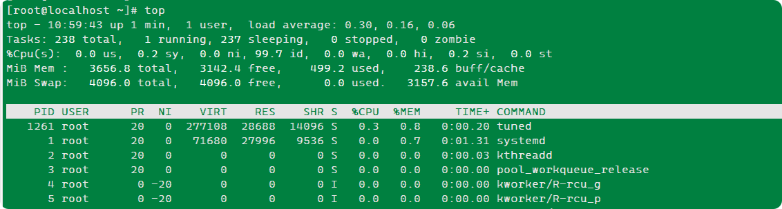 例如,从上述“tasks:….”部分信息可得知当前共有238个进程,其中正在运行的1个,休眠状态的237个,停止和僵死状态的0个。