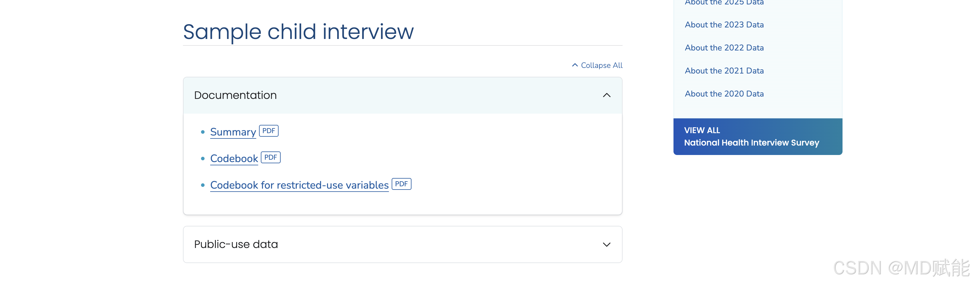 NHIS 是由美国疾病控制与预防中心(CDC)下属的国家卫生统计中心(NCHS)自1957年起持续实施的一项全国性、长期性的健康调查项目,旨在系统、全面地反映美国居民的健康状况及其变化趋势。NHIS 采用严格的分层多阶段概率抽样设计,通过入户访谈的方式,收集具有全国代表性的个体层面数据,调查内容涵盖人口社会学特征(如年龄、性别、种族和教育水平)、整体健康状况与各类慢性疾病患病情况、医疗服务的可及性与利用模式、健康相关行为(包括吸烟、饮酒、体育锻炼等)、功能障碍与残疾状况,以及家庭结构与经济状况等多个重要领域。凭借其样本量大、调查连续性强、问卷设计科学且配套提供抽样权重、分层和主抽样单元等关键信息,NHIS 能够支持研究者对美国总体人群及特定亚群体进行可靠的统计推断和趋势分析,因此已成为公共卫生学、流行病学以及卫生政策研究中最重要、使用最广泛的数据来源之一。在前面的文章中,我们已经了解了成人数据是聚焦 18 岁及以上美国非机构化居民的核心健康数据来源,其数据收集覆盖健康状况、行为习惯及医疗服务利用等关键领域,可精准反映全美成年人口的健康水平及相关影响因素。那么我们接着了解其他的数据情况。