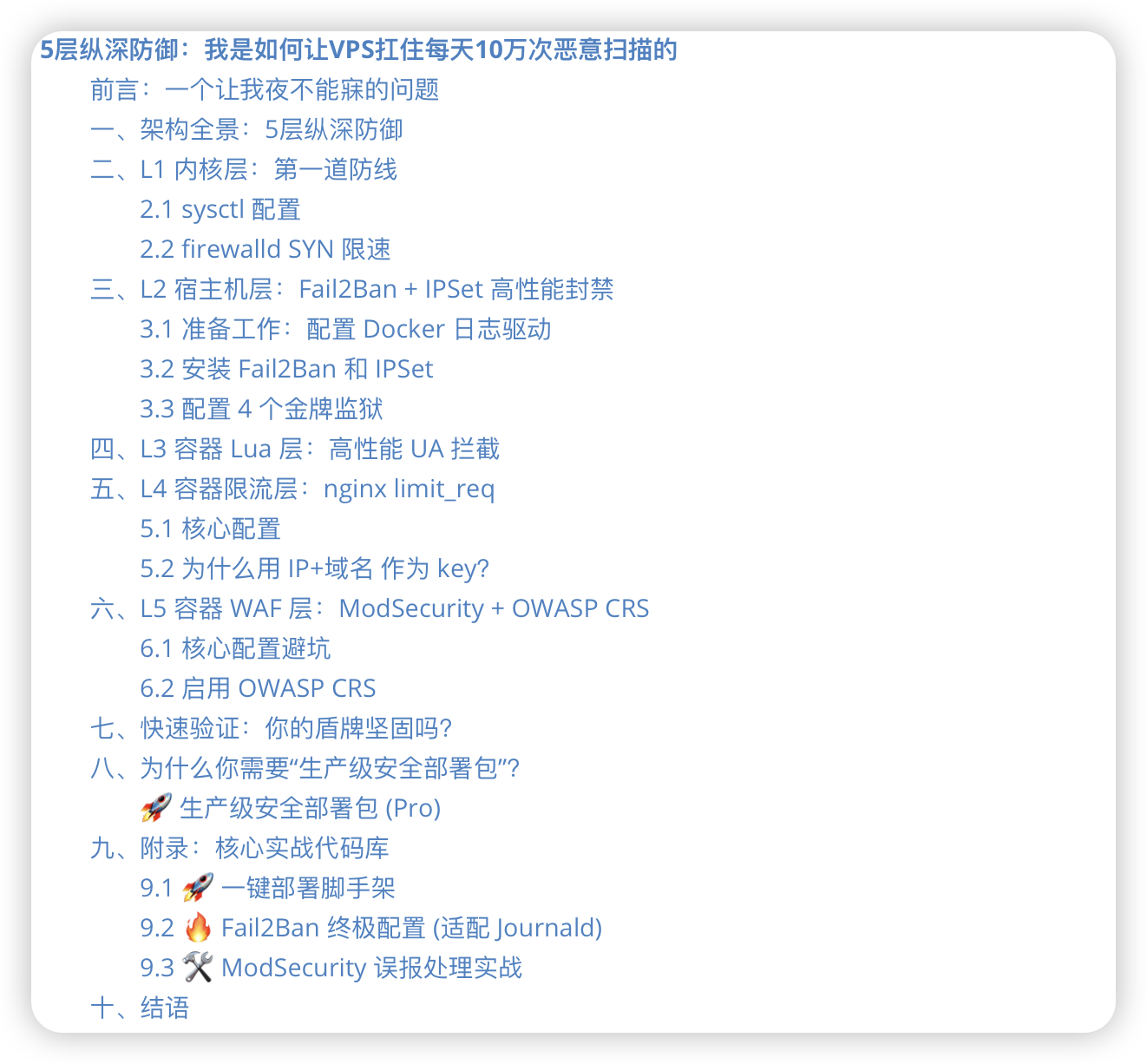 上面展示的是核心配置,足以应对 90% 的普通攻击。但从“能用”到“生产级好用”,还有很长的路要走: