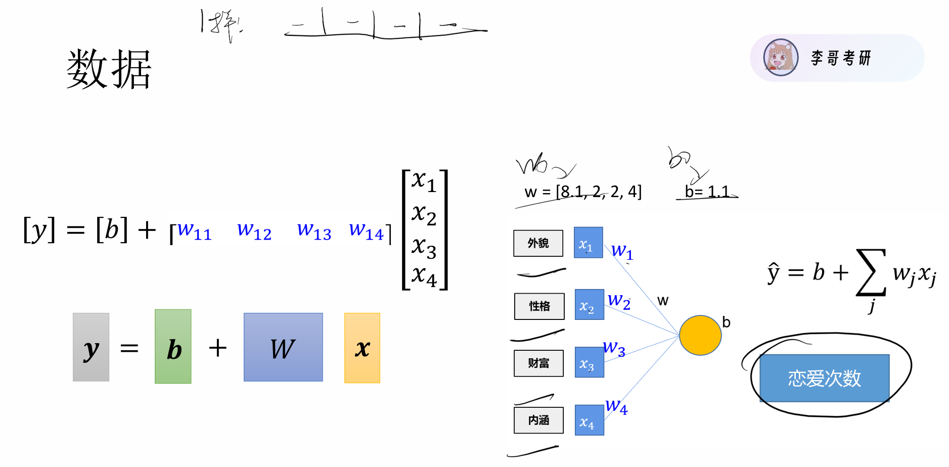 如下图,X,Y存在线性关系 这里有一个常见的误区就是 我以为是求X,Y。但其实X,Y 是已知的我们要求的是y=wx+b中的参数w和b,而非数据。在线性模型中w表示weight(权重),b表示bias(偏差)。