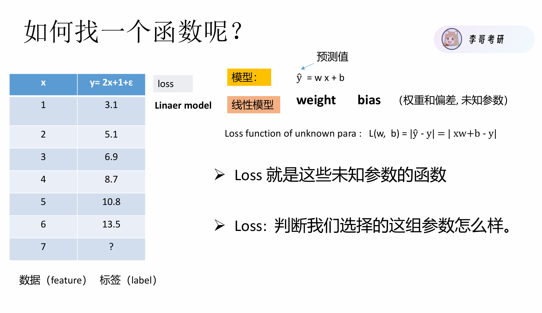 loss = 1/n * Σ|ŷᵢ – yᵢ|,它用来判断我们这一组参数取的怎么样,从公式中也可以看出,loss越小说明我们的参数越好,