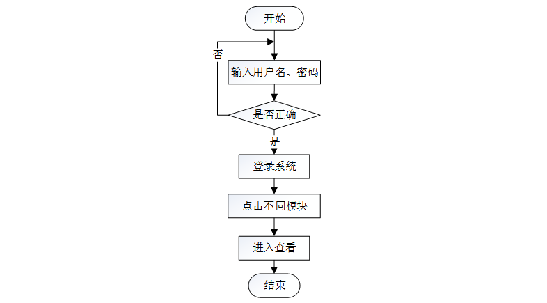 用户进入界面时,需要通过输入用户名和密码,当用户名和密码输入正确后方能登录系统,输入错误将返回上一界面。用户进入系统后点击不同模块进行查看。界面流程图如图3-6所示:
