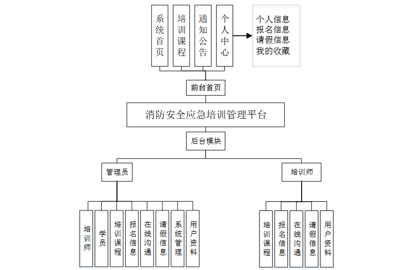 根据前文分析可知,消防安全应急培训管理系统的功能由系统管理员模块、培训师模块和学员模块三个部分组成。整体功能结构如下图所示:
