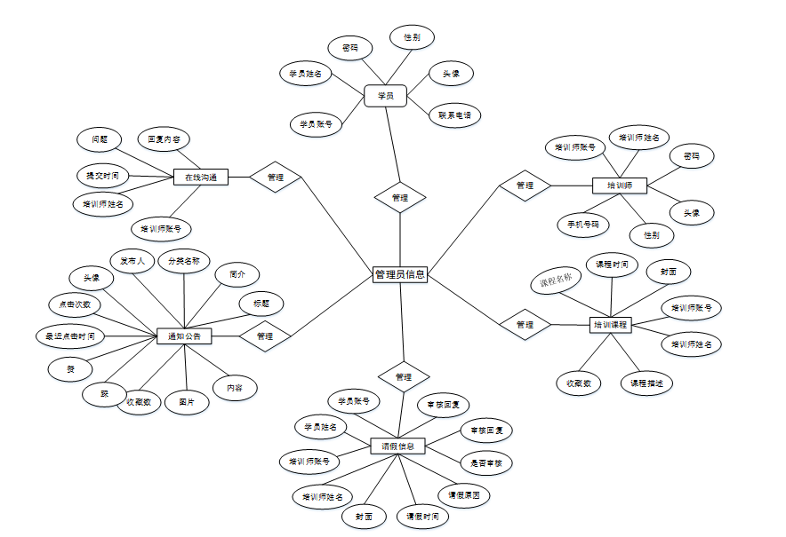 为了更直观阐明数据库的设计,通过E-R图可以清楚地描述系统涉及到的实体之间的相互关系。将“学员、培训师、培训课程、请假信息、通知公告、在线沟通”等作为实体,它们的局部E-R图,如图4-2所示: