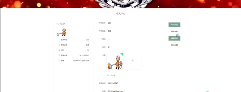 个人中心:在个人中心页面可以对个人信息进行更新信息,还可以对报名信息、请假信息和我的收藏进行详细操作;如图5-5所示: