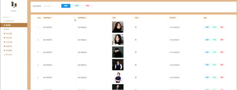 管理员点击培训师:在培训师页面输入培训师账号进行搜索、新增或删除培训师列表,并根据需要对培训师详情信息进行查看、修改或删除操作;如图5-10所示: