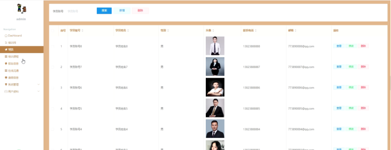 管理员点击学员:在学员页面输入学员账号进行搜索、新增或删除学员列表,并根据需要对学员详情信息进行查看、修改或删除操作;如图5-11所示: