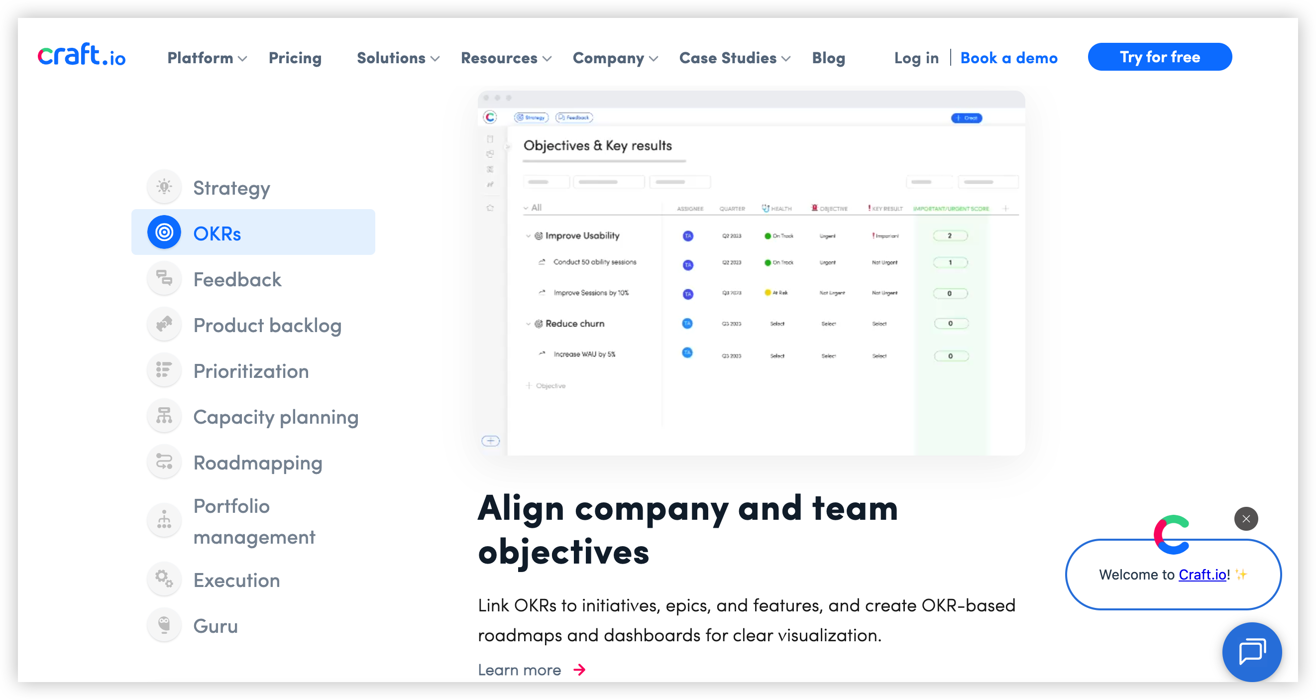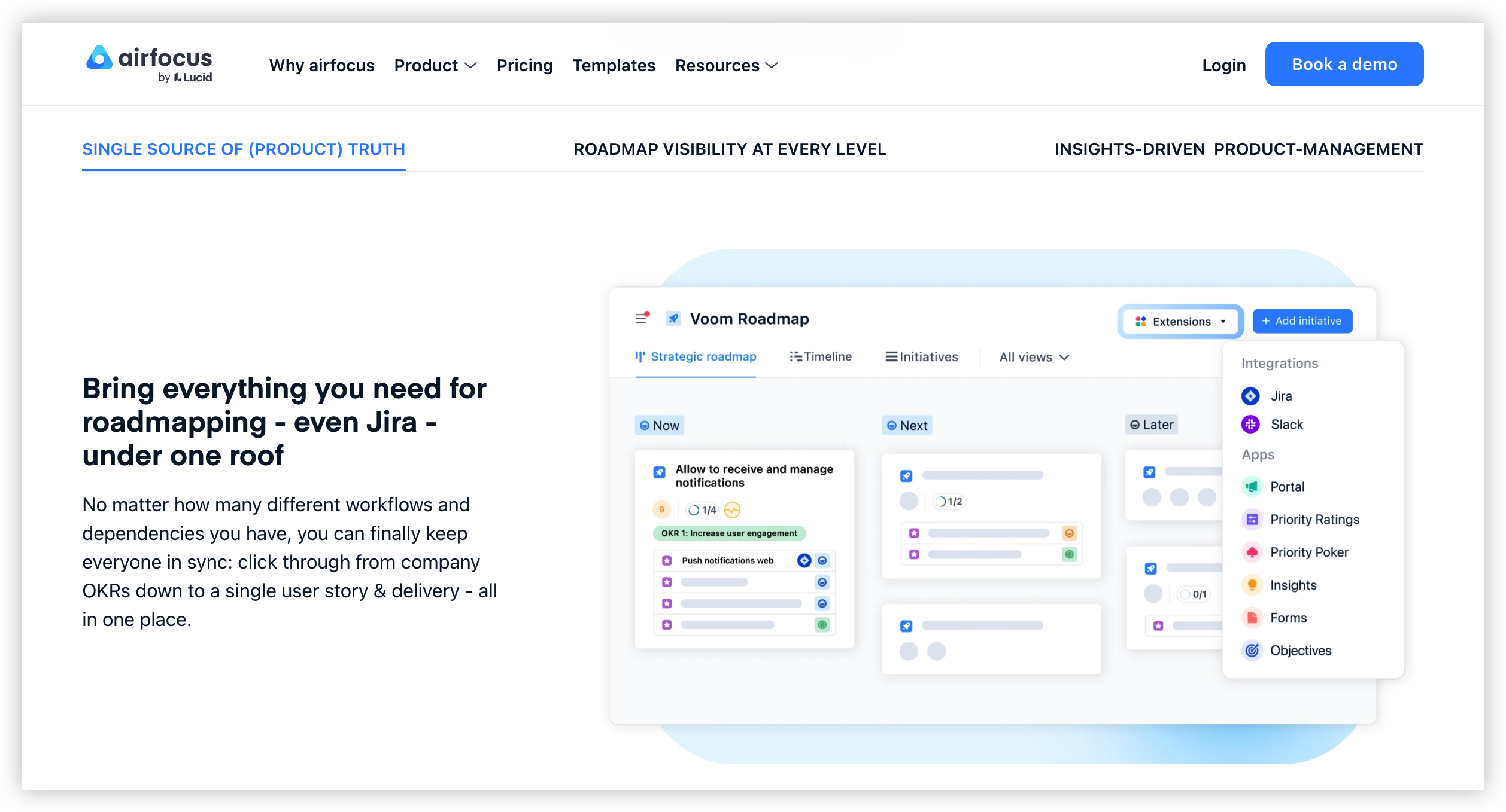 核心定位:自我定位为“模块化产品管理软件”,用于管理与沟通产品策略、优先级与路线图,并强调解决“做对问题”。