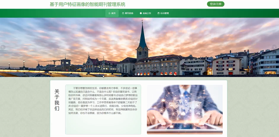 当人们打开系统的网址后,首先看到的就是首页界面。在这里,人们能够看到智能期刊管理系统的导航条和关于我们等。系统首页界面如图5-1所示: