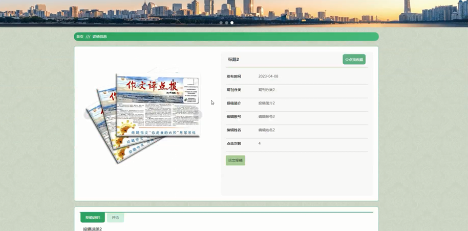 期刊信息:在期刊信息页面的输入栏中输入标题和编辑姓名进行查询,可以查看到期刊详细信息,并根据需要进行收藏、论文投稿或评论等操作;如图5-3所示: