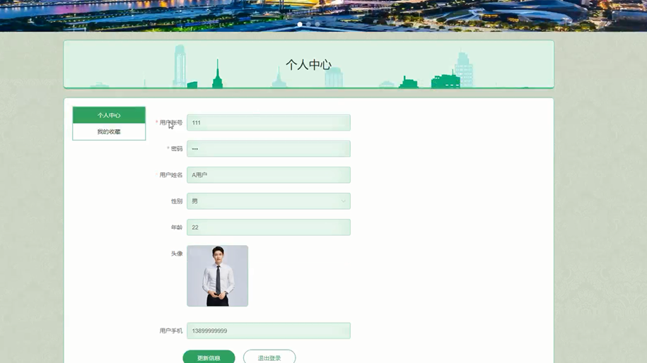 个人中心:在个人中心页面输入个人信息可以进行更新信息操作;并根据需要对我的收藏进行详细操作;如图5-5所示: