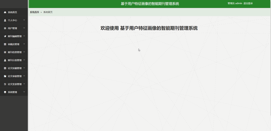 管理员进入主页面,主要功能包括对个人中心、用户管理、期刊编辑管理、审稿员管理、期刊信息管理、期刊分类管理、论文投稿管理、论文审核管理、论文发表管理、系统管理等进行操作。管理员主界面如图5-7所示: