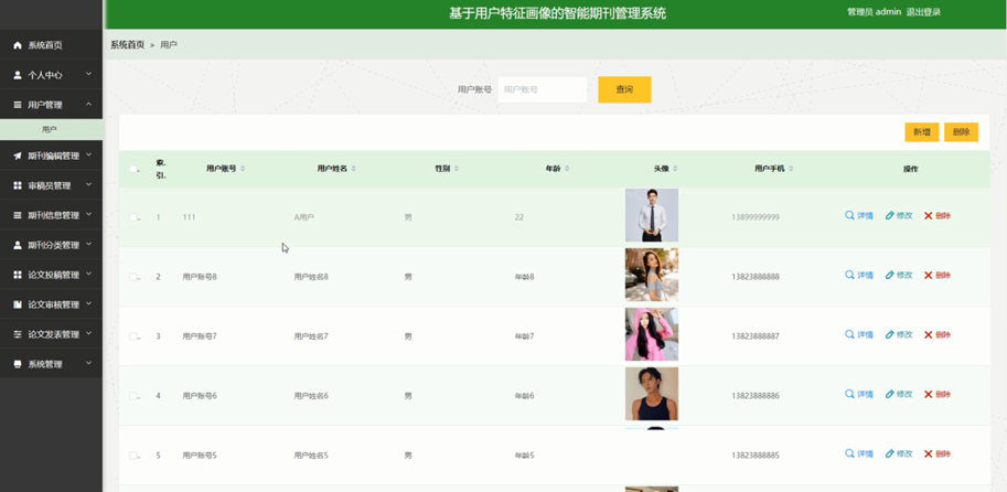管理员点击用户管理。在用户页面输入用户账号进行查询、新增或删除用户列表,并根据需要对用户详情信息进行详情、修改或删除操作;如图5-8所示: