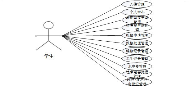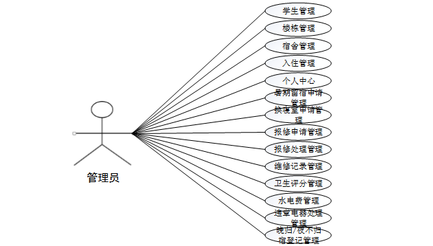 本文提出了一种基于面向对象的思想方法,以适应系统的实际功能与性能要求。为了使高校学生公寓管理更具自动化和亲和力,在对某高校学生公寓管理系统进行简单的需求分析之后,将其分为两大功能模块,分别为管理员和学生。其用例如下: