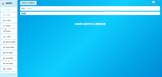 管理员进入主页面,主要功能包括对个人中心、学生管理、楼栋管理、宿舍管理、入住管理、暑期留宿申请管理、换寝室申请管理、报修申请管理、报修处理管理、维修记录管理、水电费管理、卫生评分管理、违章电器处理管理、晚归/夜不归宿登记管理等进行操作。管理员主页面如图5-3所示: