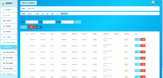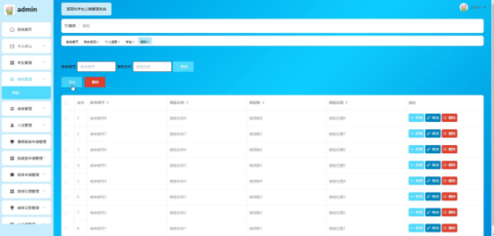 管理员点击暑期留宿申请管理。进入暑期留宿申请管理页面输入学生姓名、宿舍号、是否通过可以查询、添加、删除或审核暑期留宿申请信息,并进行查看和删除等操作。如图5-8所示: