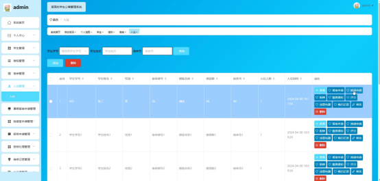 管理员点击入住管理。进入入住管理页面输入学生学号、学生姓名、宿舍号可以查询、添加或删除入住信息,并进行查看、留宿申请、换寝申请、报修、缴费通知、评分、违章电器、晚归记录、修改或删除等操作。如图5-7所示: