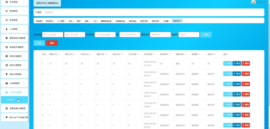 学生点击卫生评分管理。进入卫生评分管理页面输入卫生分数、评分时间、楼栋名称、宿舍号可以查询卫生评分信息,并进行查看、修改和删除等操作。如图5-13所示: