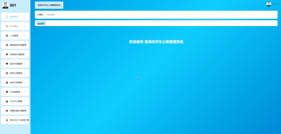 学生进入主页面,主要功能包括对个人中心、入住管理、暑期留宿申请管理、换寝室申请管理、报修申请管理、报修处理管理、维修记录管理、水电费管理、卫生评分管理、违章电器处理管理、晚归/夜不归宿登记管理等进行操作。学生主页面如图5-11所示: