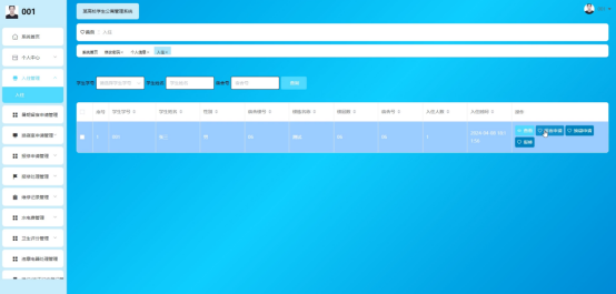学生点击入住管理。进入入住管理页面输入学生学号、学生姓名、宿舍号可以查询入住信息,并进行查看、留宿申请、换寝申请、报修等操作。如图5-12所示:
