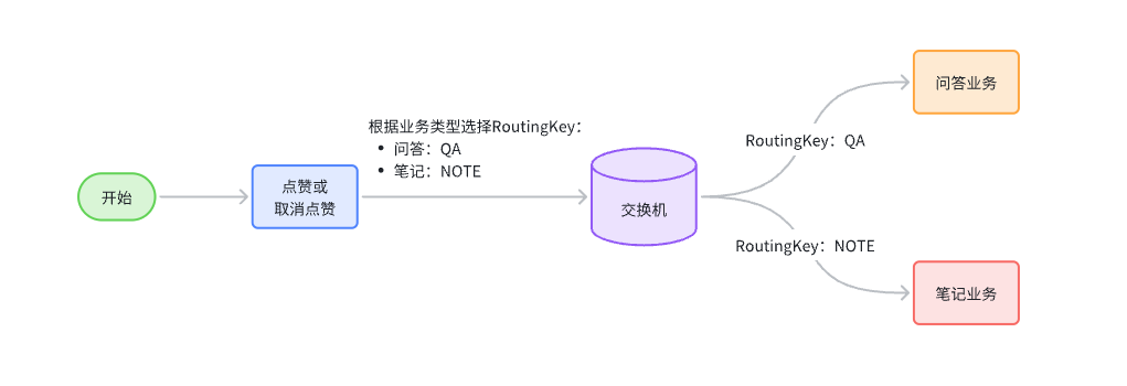 在RabbitMQ中,利用TOPIC类型的交换机,结合不同的RoutingKey,可以实现通知对象的变化。我们需要让不同的业务方监听不同的RoutingKey,然后发送通知时根据点赞类型不同,发送不同RoutingKey: