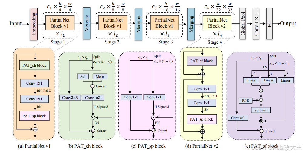 设计一种能让网络在不牺牲精度和吞吐量的前提下,保持低参数数量和计算量(FLOPs)的模块或机制,仍是一项挑战。为应对这一挑战并充分利用特征图通道间的冗余性,我们提出了一种新的解决方案 —— 部分通道机制(PCM)。具体而言,通过拆分操作将特征图通道划分为不同部分,每个部分对应卷积、注意力、池化和恒等映射等不同操作。基于这一思路,我们引入了一种新颖的部分注意力卷积(PATConv),能够高效地将卷积与视觉注意力相结合。研究表明,PATConv 可完全替代常规卷积和常规视觉注意力,同时减少模型参数和计算量。此外,PATConv 还能衍生出三种新型模块:部分通道注意力模块(PAT_ch)、部分空间注意力模块(PAT_sp)和部分自注意力模块(PAT_sf)。我们还提出了一种动态部分卷积(DPConv),其能自适应学习不同层的通道拆分比例,以实现更优的性能平衡。基于 PATConv 和 DPConv,我们构建了一个新的混合网络家族 PartialNet。该网络在 ImageNet-1K 分类任务中取得了优于现有部分 SOTA 模型的 Top-1 精度和推理速度,并且在 COCO 数据集的目标检测和实例分割任务中也表现出色。