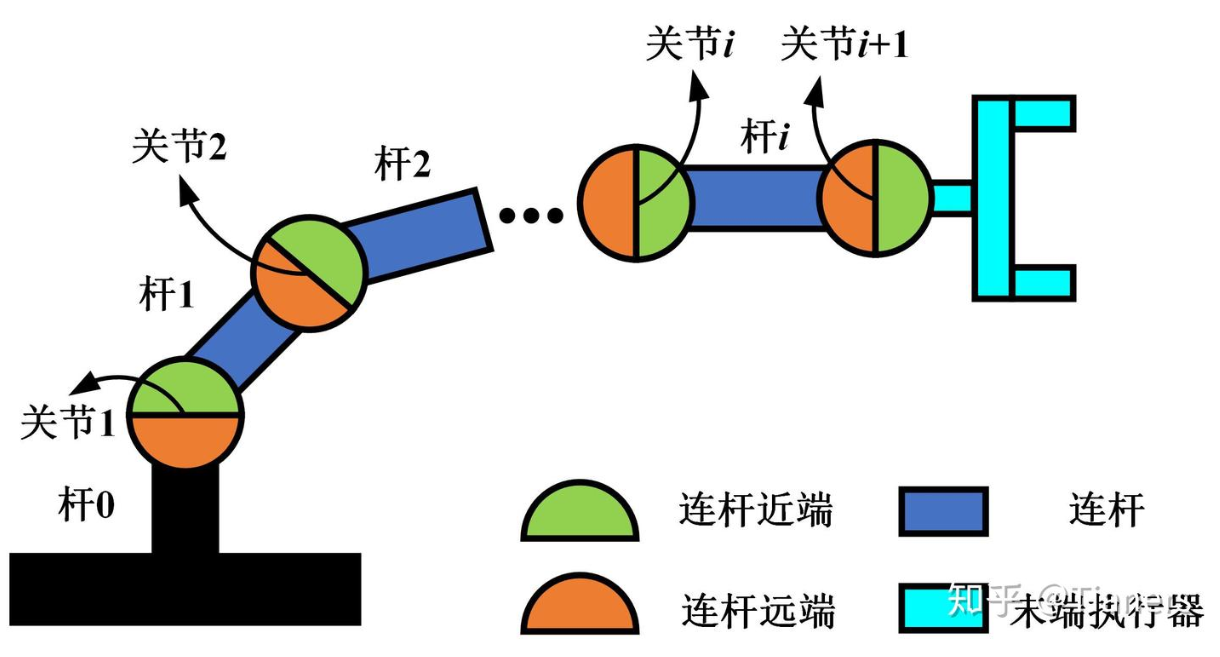 关节编号:杆i离基座近的一端(近端)的关节为关节i,远的一端(远端)为关节i+1。