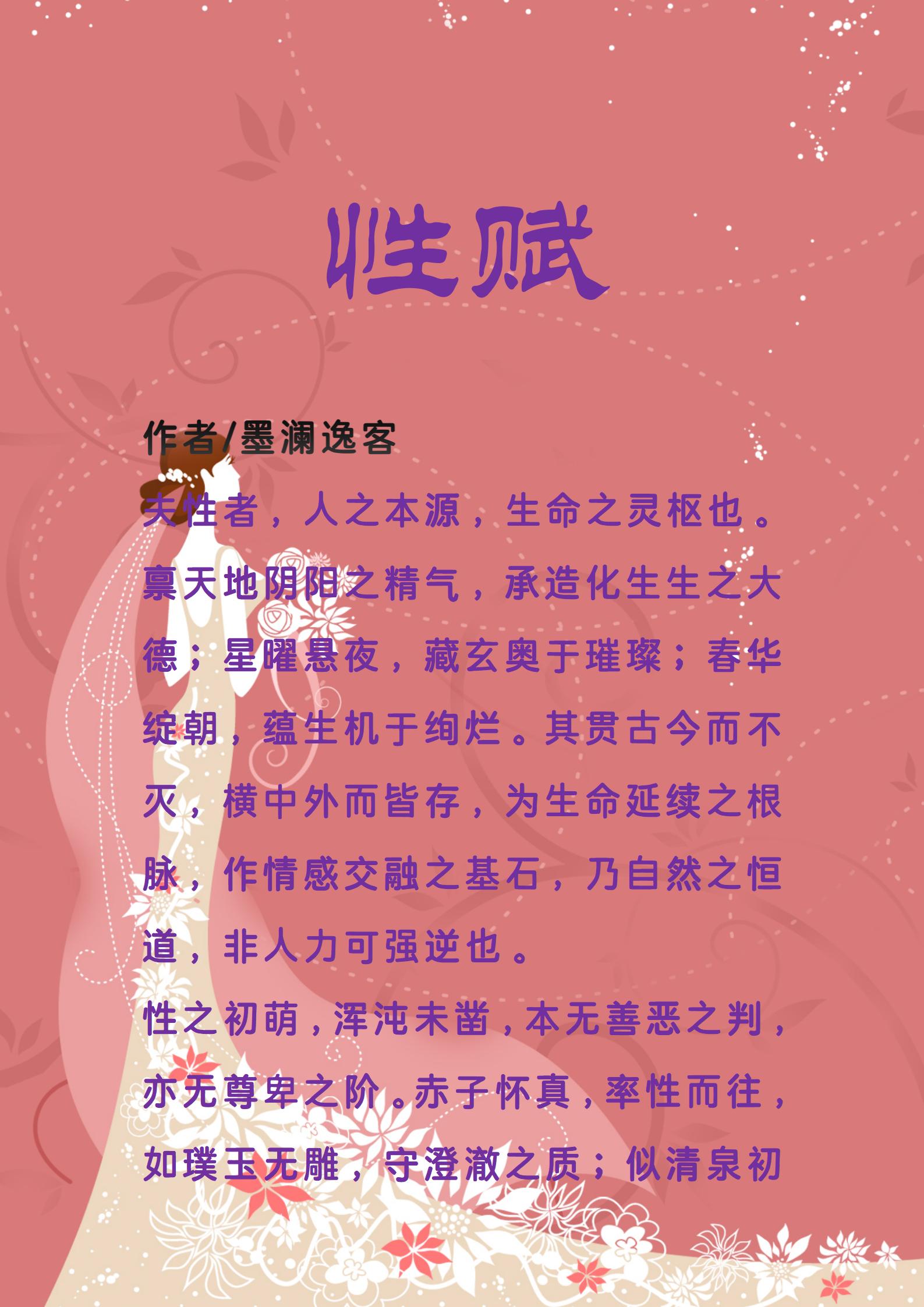 夫性者,人之本源,生命之灵枢也。禀天地阴阳之精气,承造化生生之大德;星曜悬夜,藏玄奥于璀璨;春华绽朝,蕴生机于绚烂。其贯古今而不灭,横中外而皆存,为生命延续之根脉,作情感交融之基石,乃自然之恒道,非人力可强逆也。