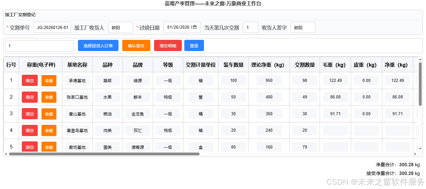 在蓝莓等水果产业园管理中,称重环节是产销衔接的核心节点,直接影响库存核算、订单履约与成本管控。本系统以电子秤称重为核心,联动全流程环节,凭借硬核技术与便捷操作,为农业果园管理注入高效动能。