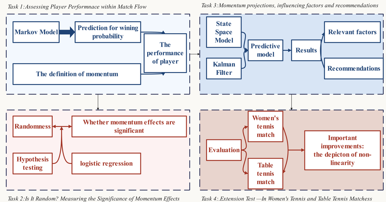 - 任务 1:通过马尔可夫模型预测胜率,结合连胜情况、局的重要性等因素定义势头,从胜率和势头两个维度评估选手表现。