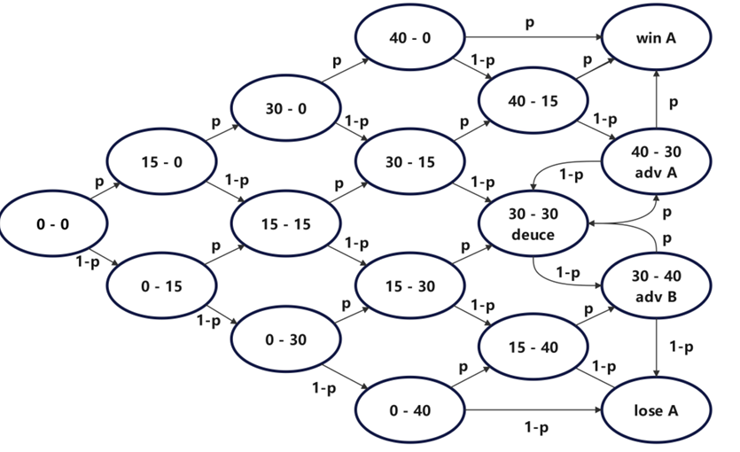 为计算特定时刻的获胜概率,我们引入马尔可夫模型。在网球比赛等未来结果仅依赖当前状态而非过往条件的过程中,获胜概率的计算仅需考虑当前比分,排除心理和外部因素的影响,因此适合采用马尔可夫链进行分析,通过事件转换关系实现概率计算。例如,可根据特定比分计算网球比赛的获胜概率,具体流程如下图所示:
