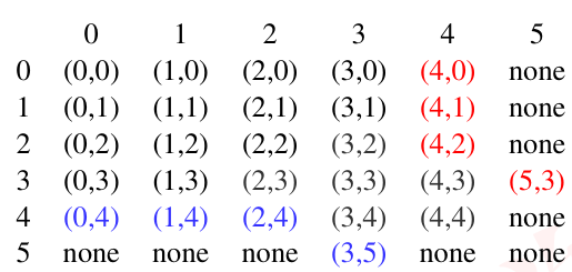 | 3 | (0,3) | (1,3) | (2,3) | (3,3) | (4,3) | (5,3) |