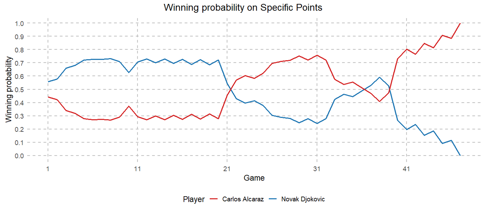 从图中可以看出,比赛局势跌宕起伏。诺瓦克・德约科维奇在第 1-21 局占据比赛优势,但 21 局后局势逆转,一直处于落后的卡洛斯・=阿尔卡拉斯掌握了主动权。然而,经过诺瓦克・德约科维奇的顽强追赶,双方在第 38 局几乎回到同一起跑线,最终卡洛斯・阿尔卡拉斯再次掌控比赛并获胜。精准的概率计算结果与人们对比赛的直观认知一致,可见胜率图能在很大程度上反映场上局势。
