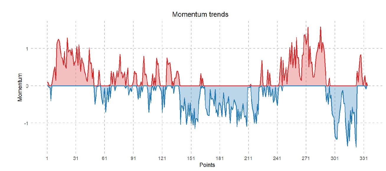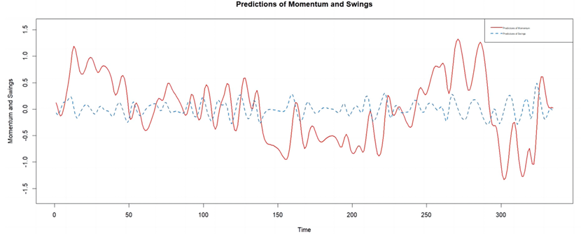 从图中可以看出,整体趋势上势头出现了两次较大的起伏,其波动情况与观众对比赛的直观认知大致相符。从细节上看,势头会根据每一分的具体情况在一定范围内波动。