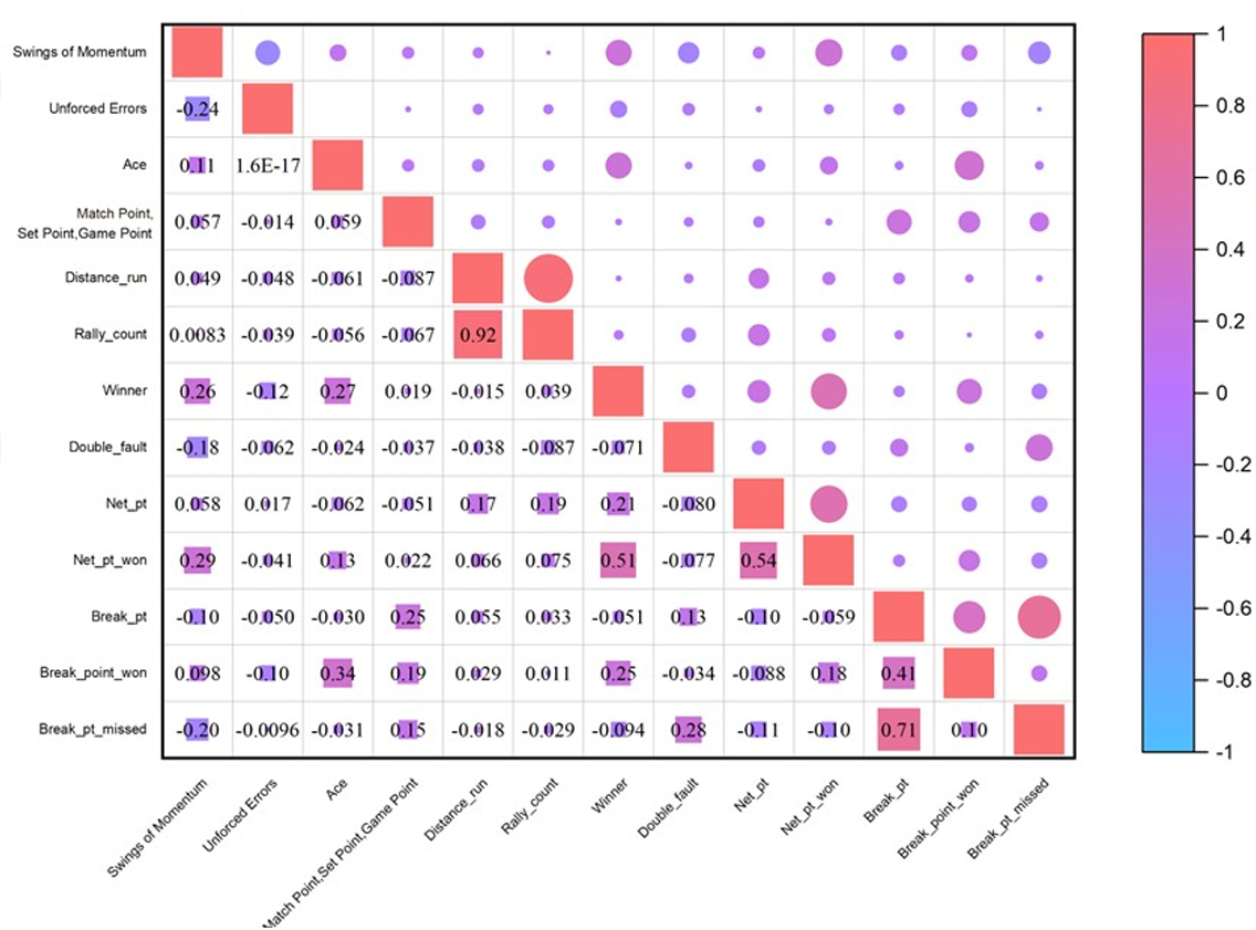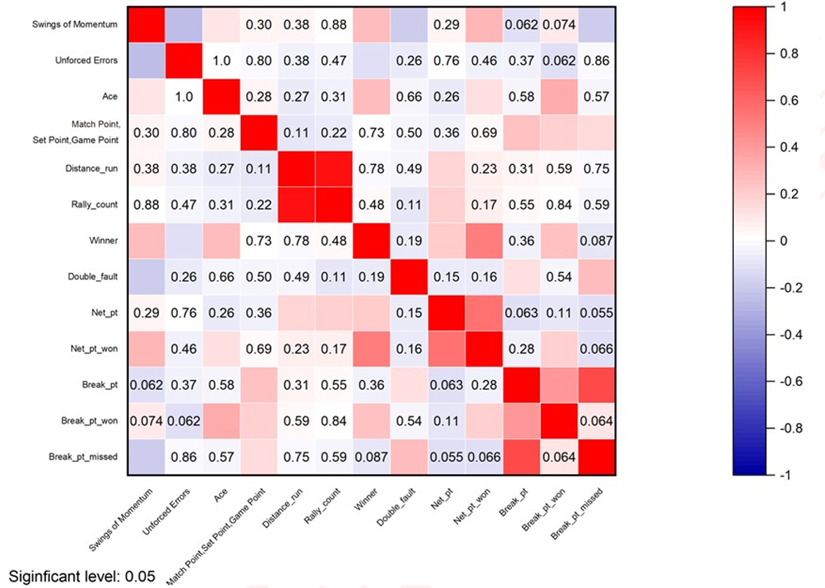 势头是否可控?有人将其描述为在比赛中悄然出现又悄然消失,但事实上,势头的走向是可以控制的,就像水流的走向可以被掌控一样。我们分析了大量真实比赛的数据集,探究势头与常见网球统计指标(如上分得分、ACE 球、跑动距离等)的相关性,发现每个因素对势头变化的影响程度各不相同。值得注意的是,双误和上网得分的 p 值小于 0.05,这意味着我们有 95% 的把握认为这些因素与势头波动相关。