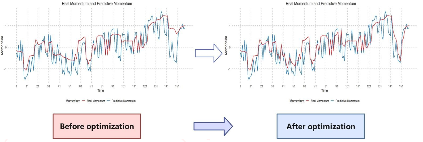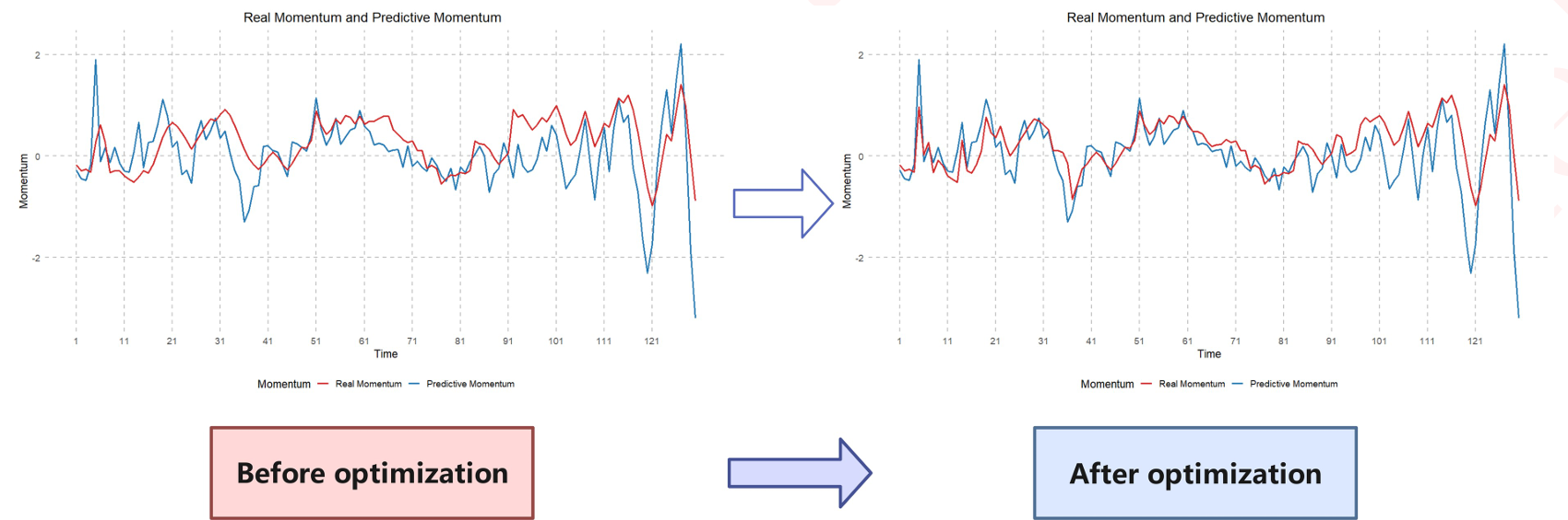 我们选取 2023 年美国网球公开赛女子单打决赛中可可・高芙与阿丽娜・萨巴伦卡的比赛进行研究。在这场比赛中,可可・高芙以 2-6、6-3、6-2 的比分逆转阿丽娜・萨巴伦卡,不仅赢得了个人首个大满贯冠军,还成为美国网球的新面孔,延续了塞雷娜・威廉姆斯的传奇。我们首先根据定义计算出阿丽娜・萨巴伦卡的势头,进而得到可可・高芙的势头,随后通过模型二得到势头的预测值,结果如下图左侧 “优化前” 所示: