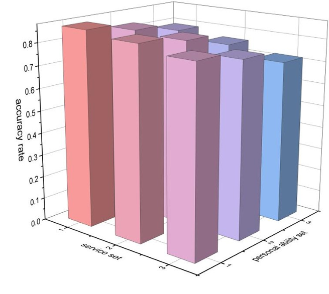为测试状态空间模型这一预测模型的敏感性,我们将数据集中除卡洛斯・阿尔卡拉斯和诺瓦克・德约科维奇外的其余 30 名选手,根据个人能力和发球得分率两个指标分为 9 组,每组 3-4 人。个人能力和发球得分率均按从高到低分组,编号为 1、2、3。每组选手均采用状态空间模型预测势头变化,并将预测结果与计算得到的势头波动真实值进行对比,得到预测准确率。随后,取每组成员的平均准确率作为该组的数值代表,绘制为以下三维图: