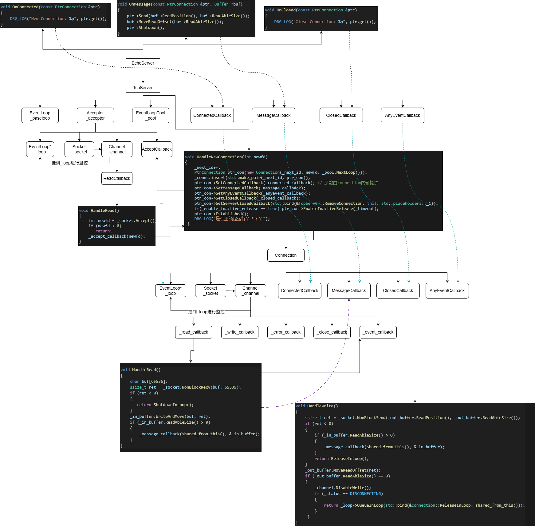 void HandleNewConnection(int newfd) ,将其分发给从属线程:Connection 对象在构造时绑定的 _loop 指针指向的是通过 threads[next_loop].GetLoop() 获取的从属线程 EventLoop。这一步就将新连接connection和从属线程 EventLoop绑定在一起。