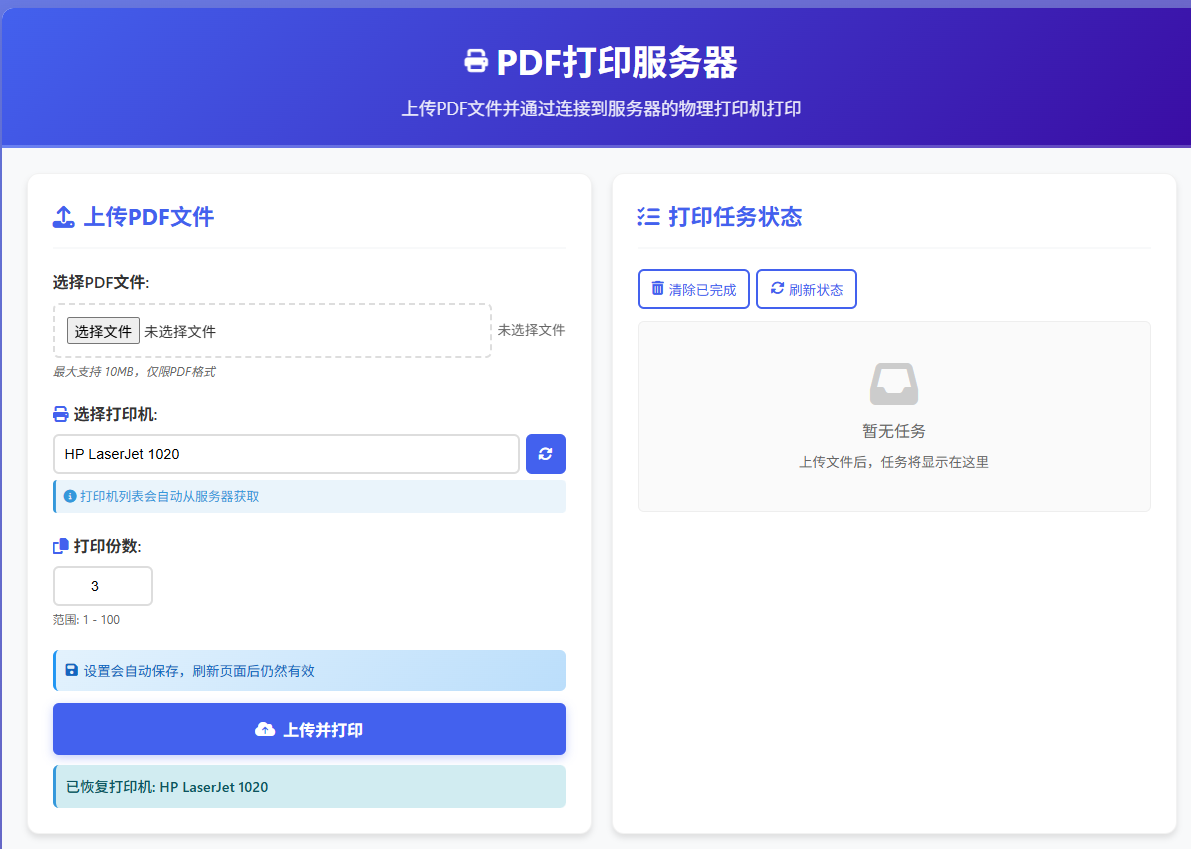 一个基于FastAPI的PDF打印服务器,支持通过网页界面上传PDF文件并打印到局域网内的物理打印机。