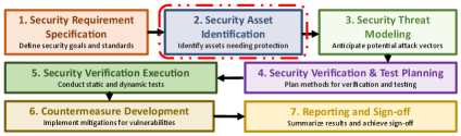 在可靠和安全的硬件系统设计中,早期准确识别安全资产为后续任务(如图1所示的威胁建模、测试计划生成、安全验证和对策开发)奠定了基础 [portillo2016building, slpsk2023protects, contreras2017security, peeters2015soc]。正如电子设计集成安全注解(SA-EDI)标准 [b4] 所强调的,资产识别不仅是硬件系统中实现可持续安全保证的第一步,而且可以说是最重要的步骤。尽管其重要性得到广泛认可,但资产识别传统上仍然是基于行业专业知识的 manual 过程 [meza2023information, 7880823],这不仅效率低下且容易出错,而且难以扩展到大型SoC设计。最近只有少数工作探索了资产识别,而且这些工作通常只在有限范围内考虑它。例如,SAIF工具 [farzana2021saif] 试图通过分析漏洞和威胁模型来识别硬件设计中的资产,而LASHED流程 [ahmad2025lashed] 则利用常见弱点枚举(CWE)漏洞来实现相同目的。然而,这两种方法都是在分析了设计漏洞之后才识别资产,而资产识别本应是安全验证流程中的首要步骤,如图1所示。类似地,[nath2025toward] 中的方法严重依赖RTL信号和寄存器命名约定,使用针对已知安全关键标识符的模式匹配;因此,它无法推广到不遵循此类约定的设计,并且无法为检测到的元素为何应被视为资产提供理由。