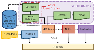 SA-EDI标准提供了在将硬件IP集成到SoC中时记录其安全相关问题的规范指南。如图3所示,安全相关信息——包括资产定义、安全弱点数据库、端口和参数相关元素以及攻击点安全目标(APSO)——与IP设计一起被捕获,并以JSON格式表示在SA-EDI对象中。该标准强调,第一步是识别设计中需要根据机密性、完整性和可用性(CIA)等安全目标进行保护的概念性资产,以及可能危害这些目标的相关结构性元素(例如,端口、参数)。为了支持这一过程,该标准参考了IEEE P3164白皮书 [b5],该白皮书介绍了概念和结构分析(CSA)方法。CSA首先识别与CIA三要素相关的概念性资产,然后将它们映射到其相应的RTL表示,即传递给SA-EDI中下一个资产定义对象的结构性资产。该方法论强调了概念性资产——需要保护的"什么",和结构性资产——体现该资产的设计中的"何处"之间的区别,确保IP开发者在将IP集成到更大的SoC设计之前全面记录安全关键资产。因此,为了解决第I节中的RQ1,我们基于SA-EDI指南中提供的见解进行构建。
