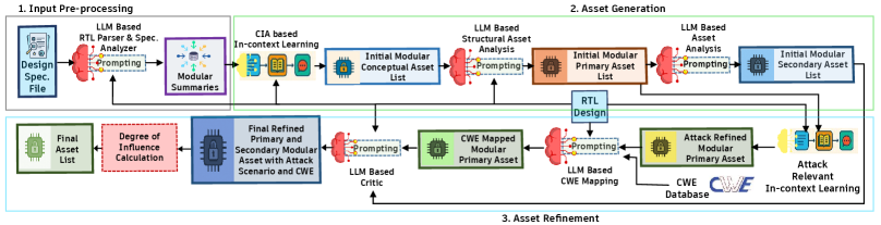 在研究了上述问题的答案后,我们提出了LAsset,这是有史以来第一个LLM辅助的自动化框架,用于在SoC和IP设计中进行全面的安全资产识别,其动机是LLM辅助框架在硬件安全验证中的成功 [sahaaccess, saha2025sv, socurellm, 11022932, bugwhisperer, saha2024empowering]。LAsset利用SA-EDI标准和IEEE P3164指南,通过LLM进行资产的初步识别。它通过将资产列表与CWE漏洞数据库进行映射来进一步验证和优化资产列表,从而确保其可信度。总之,我们工作的关键贡献如下: