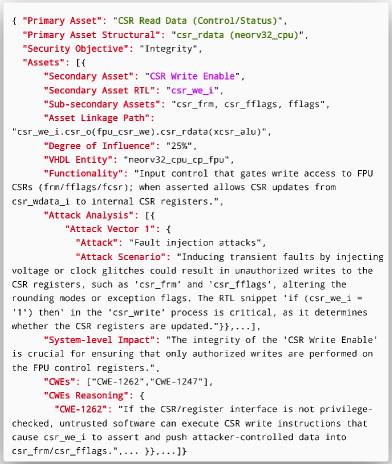 我们评估每个候选主要资产对七种硬件攻击类别的敏感性:侧信道、故障注入、安全到非安全信息泄漏、未经授权的访问、权限提升、硬件木马和拒绝服务。使用上下文训练,LLM为每个资产生成 plausible 攻击场景的高级抽象;没有此类场景的资产被排除。此分析向验证专家证明了资产包含的理由,并且通过LLM的零样本推理能力,超越了模块边界以捕获系统范围的安全影响。