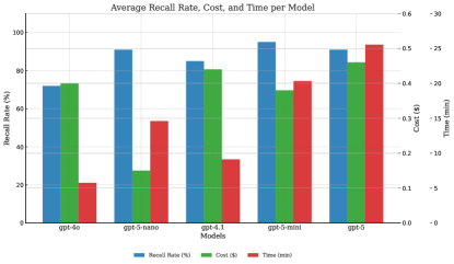 这里,T_max 和 C_max 表示一个设计观察到的最大时间和成本;R、T 和 C 分别表示相应LLM模型观察到的召回百分比、时间和成本;α、β 和 γ 表示选择偏好(例如,性能中心、延迟敏感或成本约束)。因此,较低的 MAU 对应更高效的模型。在我们的实验中,我们优先考虑性能 over 成本和时间,因此我们用 α = 0.6, β = 0.1, 和 γ = 0.3 来调整方程(2)。在此配置下,发现GPT-5-nano是具有最小MAU的最佳候选者。