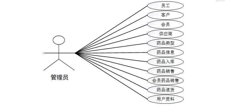 (1)、管理员关键功能包含员工、会员、客户、供应商、药品信息、药品类型、药品入库、药品销售、药品退货、会员药品销售、用户资料等进行管理。管理员用例如下: