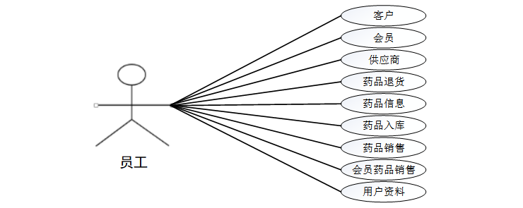 (2)、员工关键功能包含会员、客户、供应商、药品信息、药品入库、药品销售、药品退货、会员药品销售、用户资料等进行管理。员工用例如下: