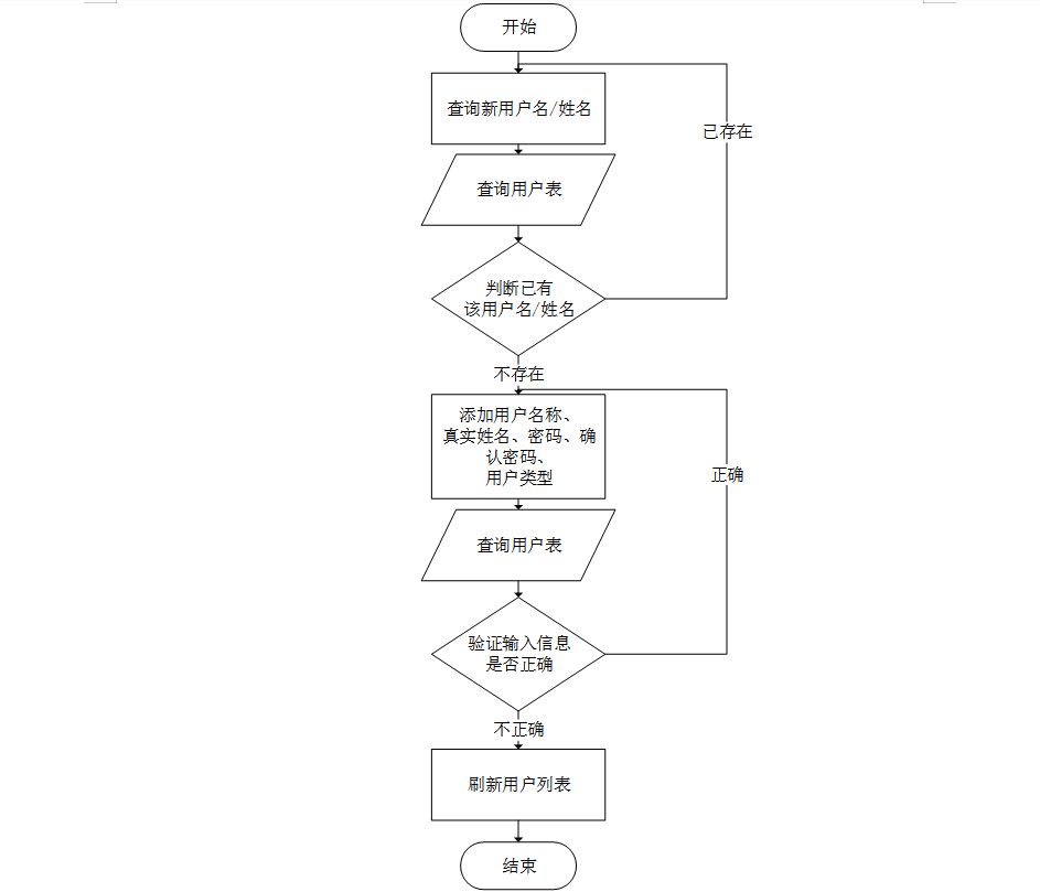 添加新用户的流程是先查询新用户名是否已存在,如已有该用户名,需重拟用户名并同时输入新用户的其它信息,添加新用户到数据库时会先验证数据是否完整,信息都正确且完整时,返回并刷新用户列表;信息不正确时,会返回输入信息的那一步。该流程如下图所示。